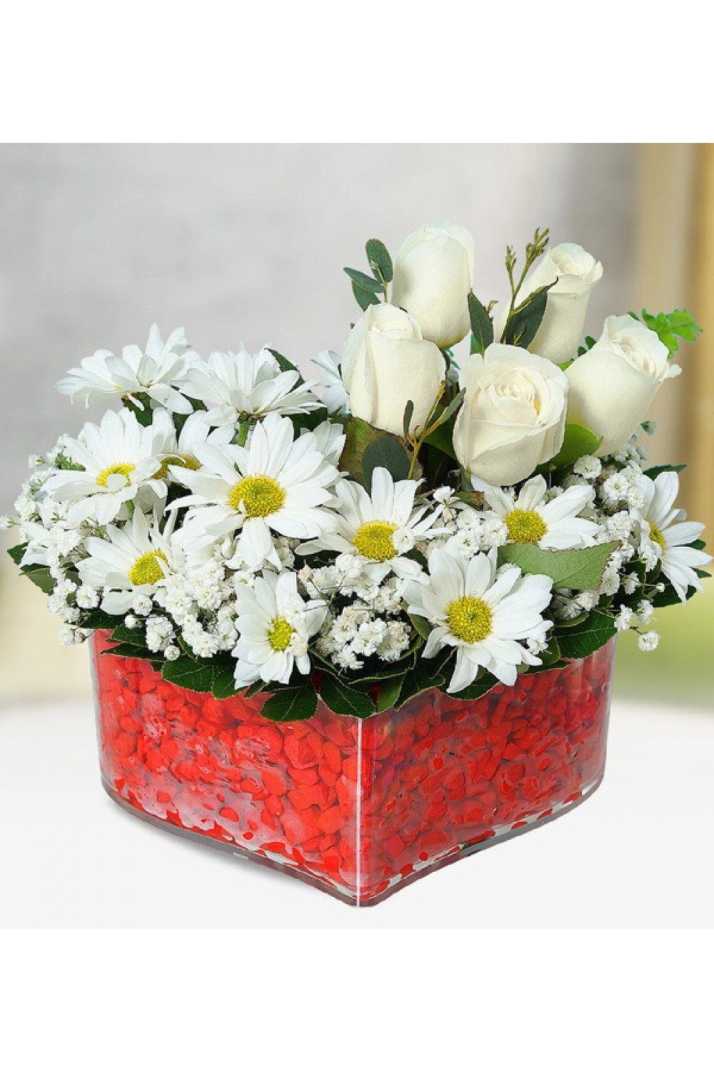 Şık tasarımı ile Kalpte Beyaz Gül ve Papatya, özenle seçilmiş taze çiçeklerle hazırlanır. Çiçeğin yaklaşık yüksekliği maksimum 10 cm boyutlarındadır.